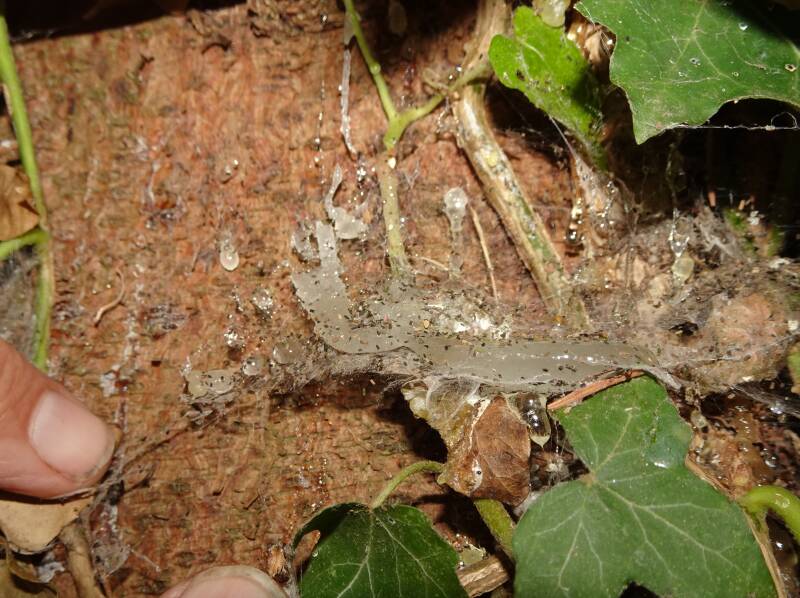 Beute mitnehmen – Manche Raubtiere bringen ihre Beute an einen sicheren Ort, z. B. auf einen Ast am Stamm, um sie dort zu fressen. Dabei bleibt die schleimige Substanz zurück.
