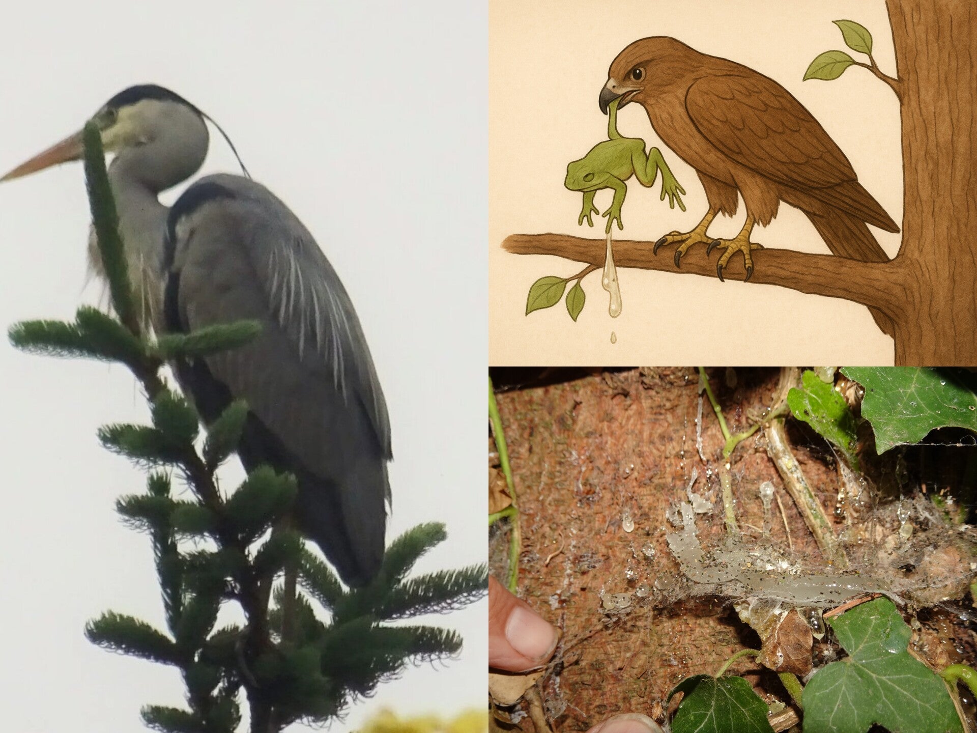 Vögel als Verursacher – Reiher, Krähen oder Eulen fressen häufig Frösche und Kröten und tun dies manchmal auf einem Ast. Die Reste werden ausgespuckt und bleiben in der Höhe zurück.